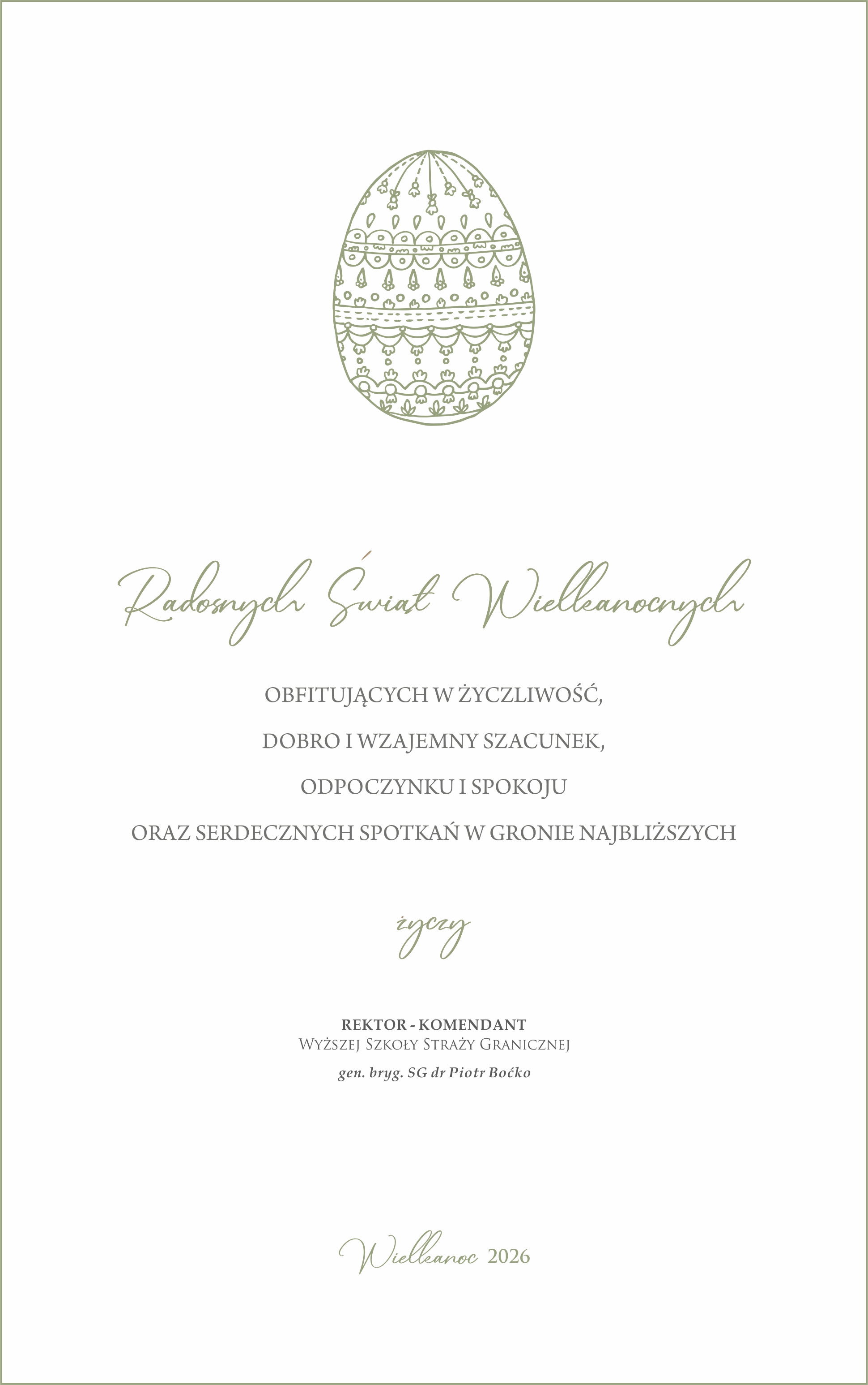 Z okazji Świąt Wielkanocnych Rektor-Komendant Wyższej Szkoły Straży Granicznej gen. bryg. SG dr Piotr Boćko wraz ze społecznością akademicką Uczelni składa świąteczne życzenia